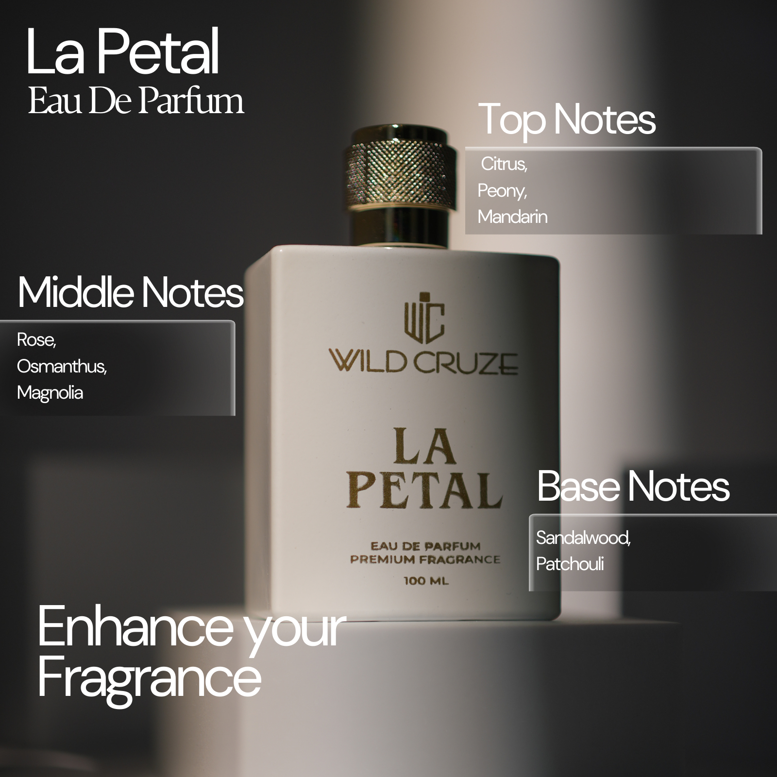 Opening with fresh citrus and peony, the scent blossoms into a heart of rose and osmanthus, before settling into a soft, lingering sandalwood and patchouli base. Elegant yet playful, La Petal is crafted for the woman who embodies charm, beauty, and effortless confidence.